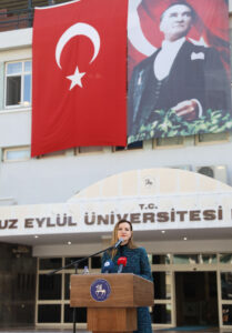 Törenin açılışında bir konuşma yapan DEÜ Rektörü Prof. Dr. Nükhet Hotar, Dokuz Eylül Üniversitesi’nin denizcilik alanında öğretim ve araştırma faaliyetleri yürüten öncü bir kurum olduğunu belirterek, “Üniversitemiz, deniz bilimleri alanında devletimizin verdiği ulusal/uluslararası görevleri başarıyla icra ediyor. Akademi dünyasında olduğu kadar; milletimize, devletimize, tarihimize ve kültürümüze karşı sorumluluklarını da yerine getiren üniversitemiz, bu alanda birçok değeri yetiştirmiş, öncü olmuş ve örnek çalışmalara imza atmıştır. Bu bağlamda, Batı Anadolu’nun Türkleşmesinde ve tarihte ilk Türk donanmasının teşkil edilmesinde pay sahibi olan; 1081 yılında Doğu Roma’nın elinden güzel kentimizi alan Çakabey de, denizci üniversitemizin ilham aldığı tarihi şahsiyetlerden birisi olmuştur. Türk Deniz Kuvvetlerimizin kuruluş tarihine de kaynaklık eden ve büyük milletimize denizlerdeki ilk zaferi yaşatan Çakabey’in adını ve şanını yaşatmayı büyük ailemizin sorumluluklarından biri olarak görüyoruz” dedi.