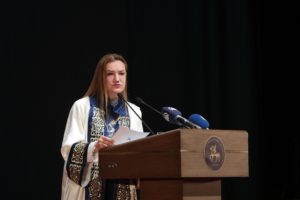 Rektör Hotar, “Üniversitemizin mensubu olma ayrıcalığına sahip bireyler olarak, aydınlık geleceğinize emin adımlarla ilerleyeceksiniz. Uzmanlık alanınıza yönelik kazandığınız akademik bilgiler sizlere yol gösterecek; hocalarınızın tecrübeleri çalışmalarınıza ışık tutacak; kurduğunuz dostluklar ise kariyer yolculuğunuzda sizlere destek olacaktır. Size değer veren bir büyüğünüz olarak söylemek isterim ki, hangi bölümden ya da programdan mezun olursanız olun; aklınızın ve vicdanınınız yolundan lütfen ayrılmayın. Maddi kaygılar peşinde koşarak, hayatın güzelliklerini kaçırmayın. Girişimci olun ama temkinli davranın. Aklınızı kimseye emanet etmeyin; hata yapmaktan da korkmayın. Aziz milletimize ve ailenize karşı sorumluluklarınızı yerine getirin. En önemlisi de bu ülkeyi sizlere emanet eden şehitlerimizi, kahramanlarımızı, gazilerimizi asla unutmayın. Birlik ve beraberliğimiz için hayatlarını hiçe sayan; güzel ülkemizin kurulmasında ve bugünlere gelmesinde emeği geçen başta Gazi Mustafa Kemal Atatürk olmak üzere aziz şehitlerimizi ve devlet büyüklerimizi rahmetle anıyor; kahraman gazilerimize sağlık ve afiyet diliyorum” diye konuştu.