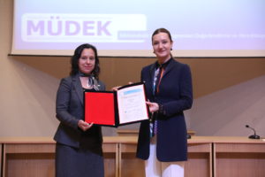 MÜDEK Yönetim Kurulu Başkan Yardımcısı Prof. Dr. Müjgan Sağır, yaptığı sunum ile MÜDEK hakkında bilgi verdi. Prof. Dr. Müjgan Sağır, sunumunun ardından Rektör Prof. Dr. Nükhet Hotar’a akreditasyon belgesini takdim etti.