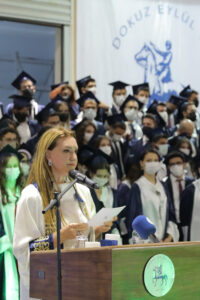 Törenin açılışında bir konuşma yapan DEÜ Rektörü Prof. Dr. Nükhet Hotar, tıp eğitimini başarıyla tamamlayan öğrencilerin heyecanını paylaştıklarını belirterek, “Pandemi şartlarına rağmen eğitimlerine ara vermeyen genç hekimlerimizi; onları yetiştiren ailelerimizi ve tabi ki hocalarımızı kutluyoruz. İnsanlara şifa dağıtacak evlatlarımızın üniversitemizi gururla temsil edeceklerine inanıyoruz. Üniversitemiz, aklını ve vicdanını kullanan hekimleri topluma kazandırmaya devam edecek” dedi.