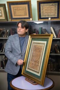 Yazma eserler arasında dikkat çeken parçalar bulunduğunu belirten Sofuoğlu, “Kütüphanemizdeki yazma eserler arasında her sayfası altın varakla bezenmiş çok nadide Kur-an’ı Kerimler yer almaktadır. Bu eserler arasında Gazi Mustafa Kemal’in Şadırvan Camii’ne hediye ettiği ve imzaladığı taş baskı Kur-an tercümesi de bulunmaktadır. Düşülen 15 Teşrinievvel 1341 tarihli notta; Reis-i Cumhur Gazi Mustafa Kemalpaşa Hazretleri tarafından Şadırvan Camii Şerifine ihdaa buyurulmuştur, ifadeleri yer almaktadır. Kur-an’ı Kerim tercümesi ise ‘Türkçe Kur-an’ı Kerim yeryüzünde Türkçeyi anlayan milyonlarca Müslümana yadigar’ ifadesi ile başlamaktadır” dedi. Sofuoğlu, Hafız Osman’a ait 1301 tarihli Hilyeyi Şerif Levhası’nın da aralarında bulunduğu hat levhalarında dualar ya da hazreti peygamberi öven şiirlerin yer aldığını söyledi.